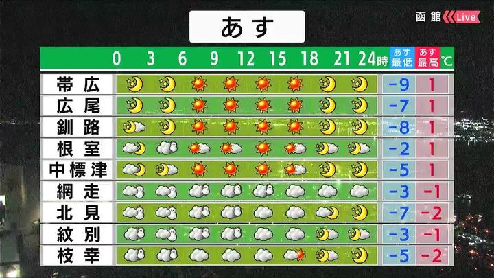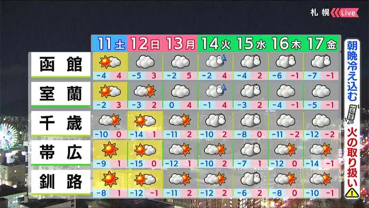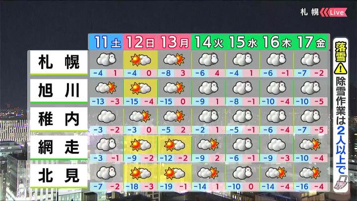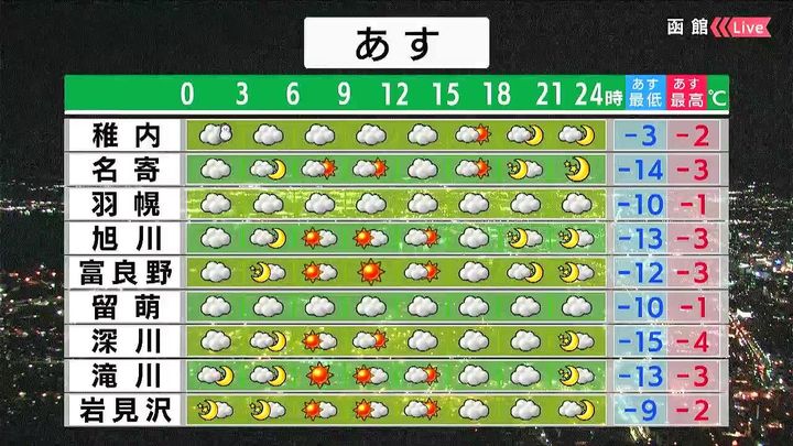 稚内や留萌は曇るでしょう。旭川や岩見沢など内陸は晴れ間が出ますが、朝の冷え込みが強まり、旭川の最低気温は‐13度です。