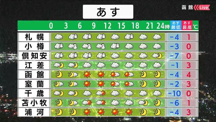 札幌や小樽は日中にかけて雪が降るでしょう。倶知安も午前中は弱い雪が降りますが、函館や浦河はよく晴れます。