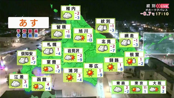 背景は10日午後5時10分頃の紋別情報カメラ