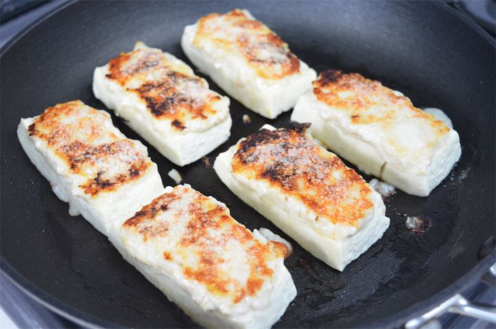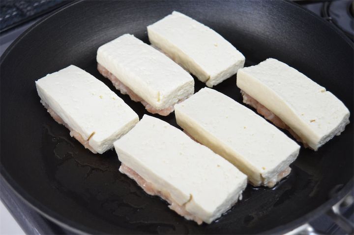 5.フライパンに油を熱し、鶏ひき肉の面から焼く。焼き色が付いたら弱火にして2~3分焼き、裏返して火力を強め、豆腐の面を焼く。