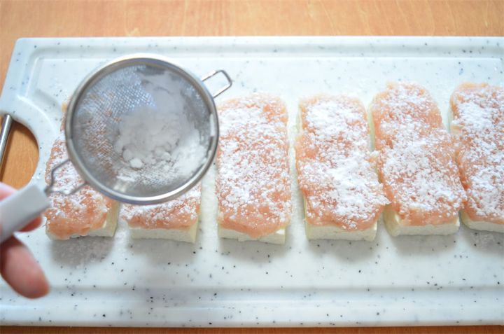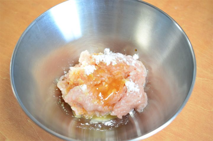 4.2のひき肉を3の上にのせて、鶏ひき肉の上に片栗粉(分量外)を振りかける。