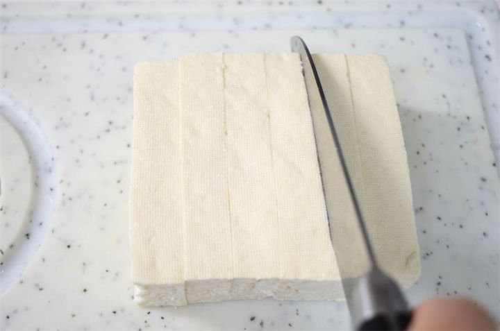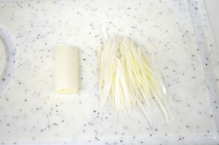 1.豆腐をキッチンペーパーで包み、重しをのせて水気を切る。長ねぎは千切りにして白髪ねぎを作る。