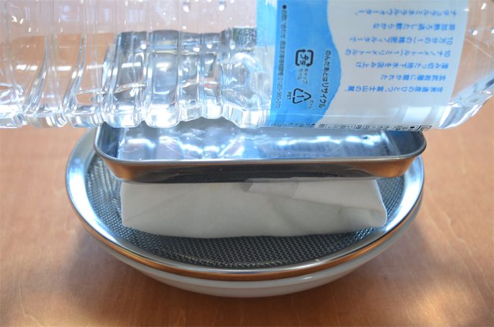 水を入れたペットボトルを重しにして、30分ほど置きました。