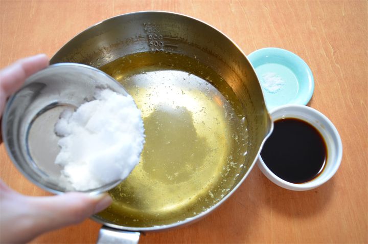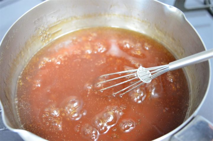 6.別の鍋に水、コンソメスープ、砂糖、しょうゆ、塩を入れて煮立たせる。煮立ったらお酢を加えて混ぜ合わせ、水で溶いた片栗粉でとろみを付けたら火を消す。