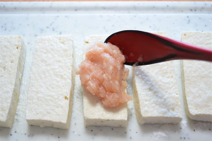 焼くと縮むので、豆腐から鶏ひき肉が少しはみ出るくらいのせましょう。