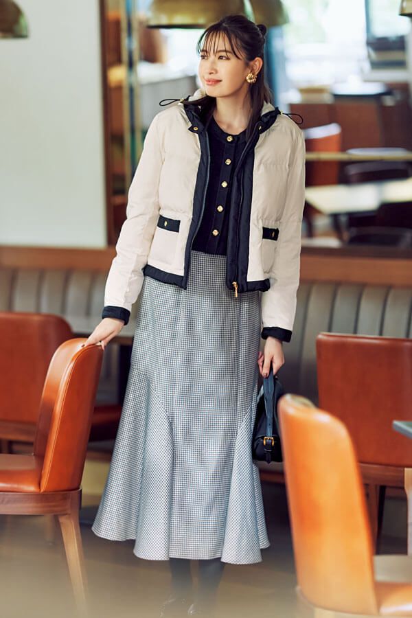 ジャケット感覚なデザインでダウンのボリューム感をオフ。バイカラーのフレーム効果を利用してシュッとした佇まいに誘導して。モノトーンで奥行きを作って品よく美スタイルを実現!