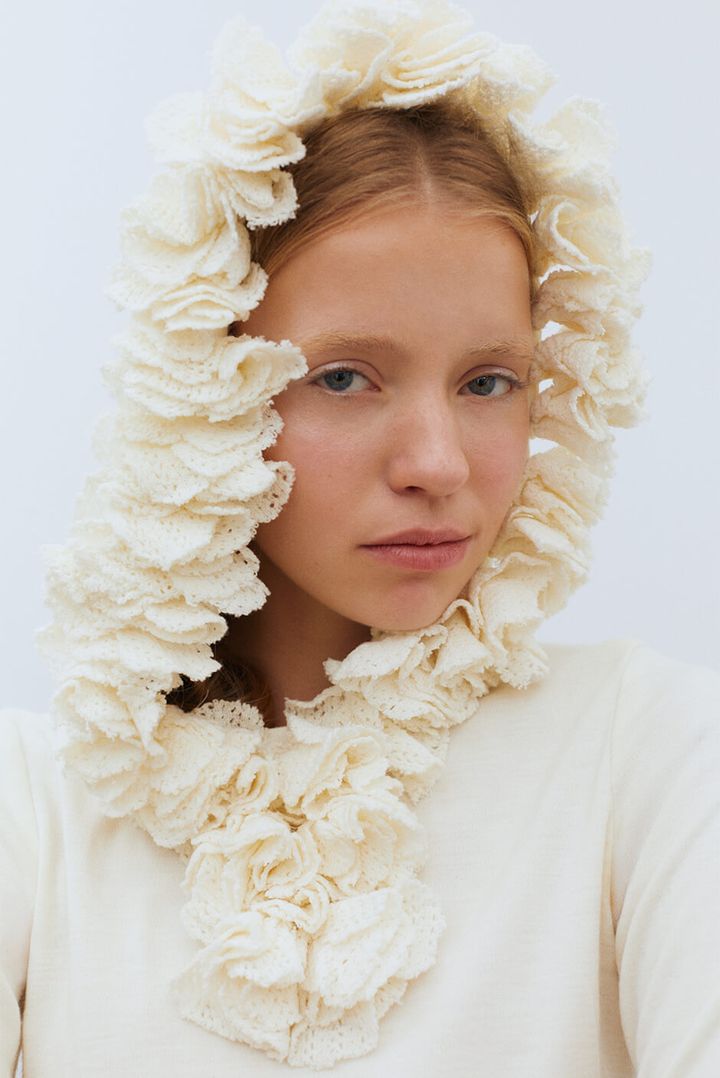 top by AITORGOIKOETXEA, earrings and rings by CAJAL, headdress and shorts stylist’s own