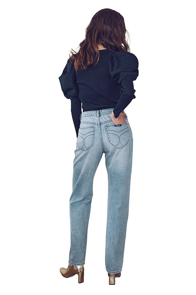 黒リブパフショルダーニット/ソブ(フィルム) ヴィンテージストレートデニムパンツ/ROLLA’S(ジャック・オブ・オール・トレーズ プレスルーム) ゴールドショートブーツ/ラベルエチュード