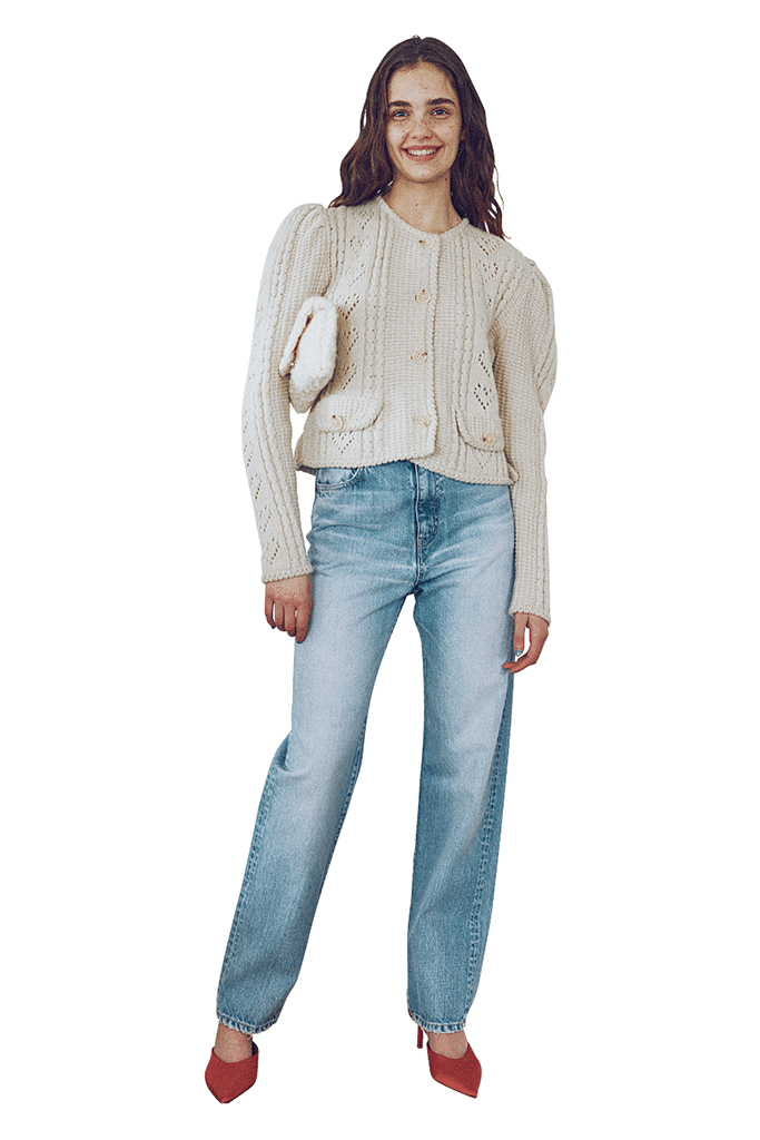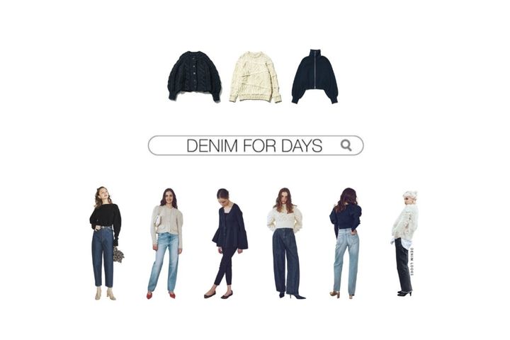思いきりフェミニンに振っても糖度ひかえめにおさまるのが、ニットとデニムのいいところ。シックなモノトーンならなおのこと。それだけで甘さのある白には少し古着のような深みを、ハンサムな黒はモードにもふるまえる強気な立体感で“かわいい”にも差をつけるとさらに完成度は高く。