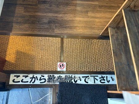 入り口で食券を購入します。豚骨MEN(こってり)、豚骨MEN(あっさり)、醤油MENをメインに、お得なランチセットや期間限定のメニューもあるようです。 中に入ろうとするとなんと、「ここから靴を脱いでください」と書かれています!