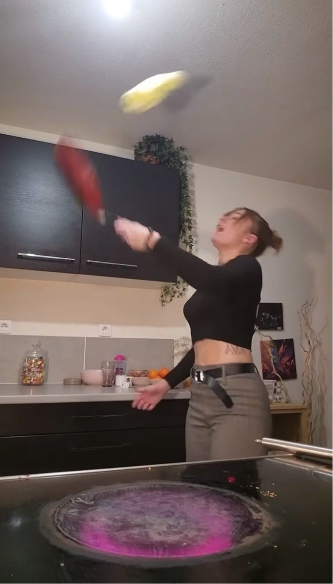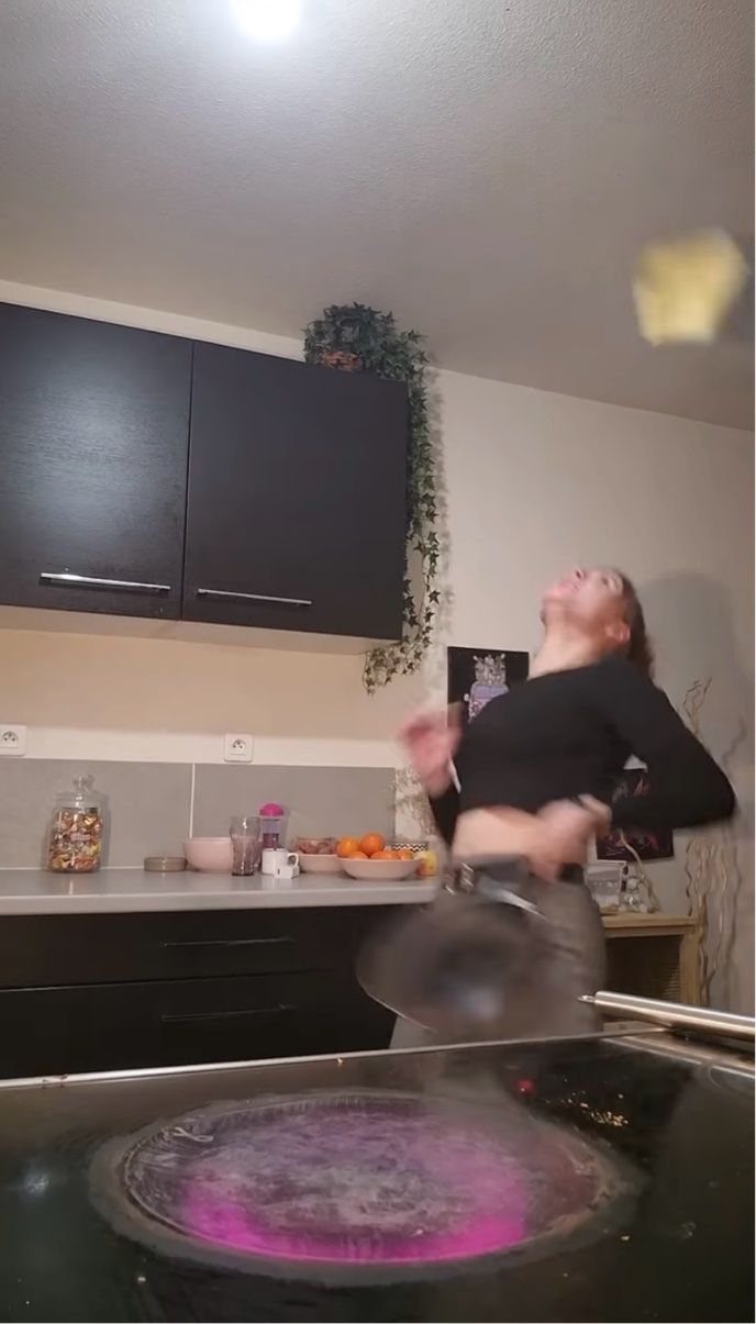 フライ返しを使わずに、クレープ生地を宙でひっくり返そうとする女性。 無謀に思われるそのチャレンジの行く末を見ていきましょう!