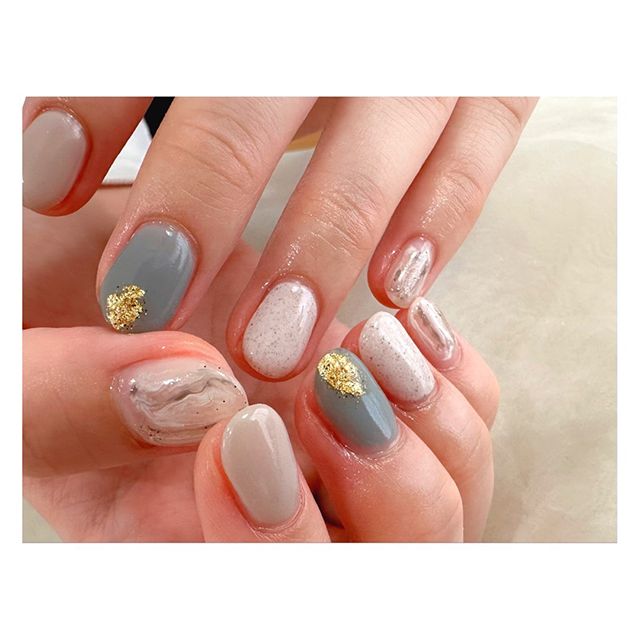 薄いグレージュとホワイトカラーにミックス加工をしたネイルカラーを合わせると、