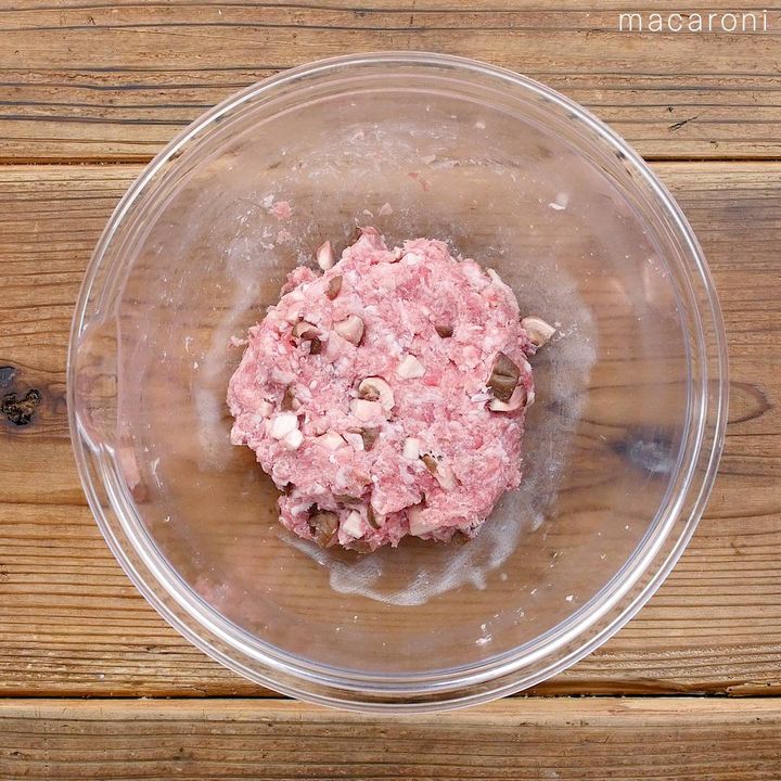 1: ボウルに豚ひき肉、しいたけ、塩こしょうを入れて粘り気が出るまで混ぜ合わせます。