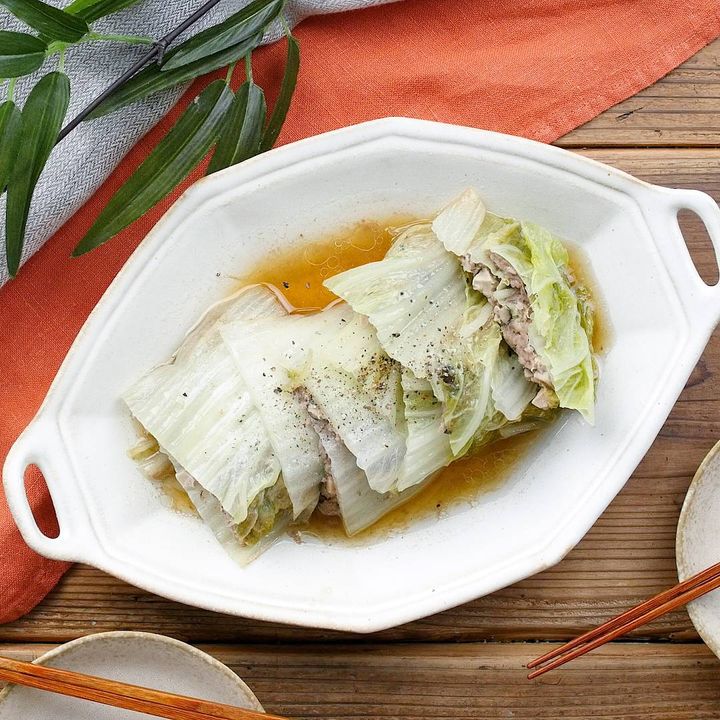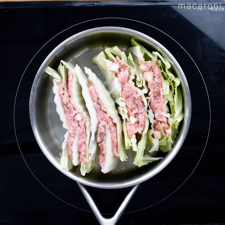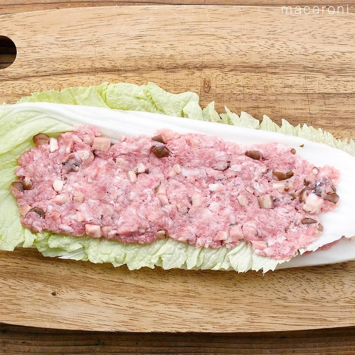 2: 白菜1枚に①を1/4量をのせ、白菜を重ねて4回繰り返します。