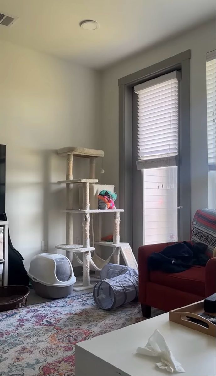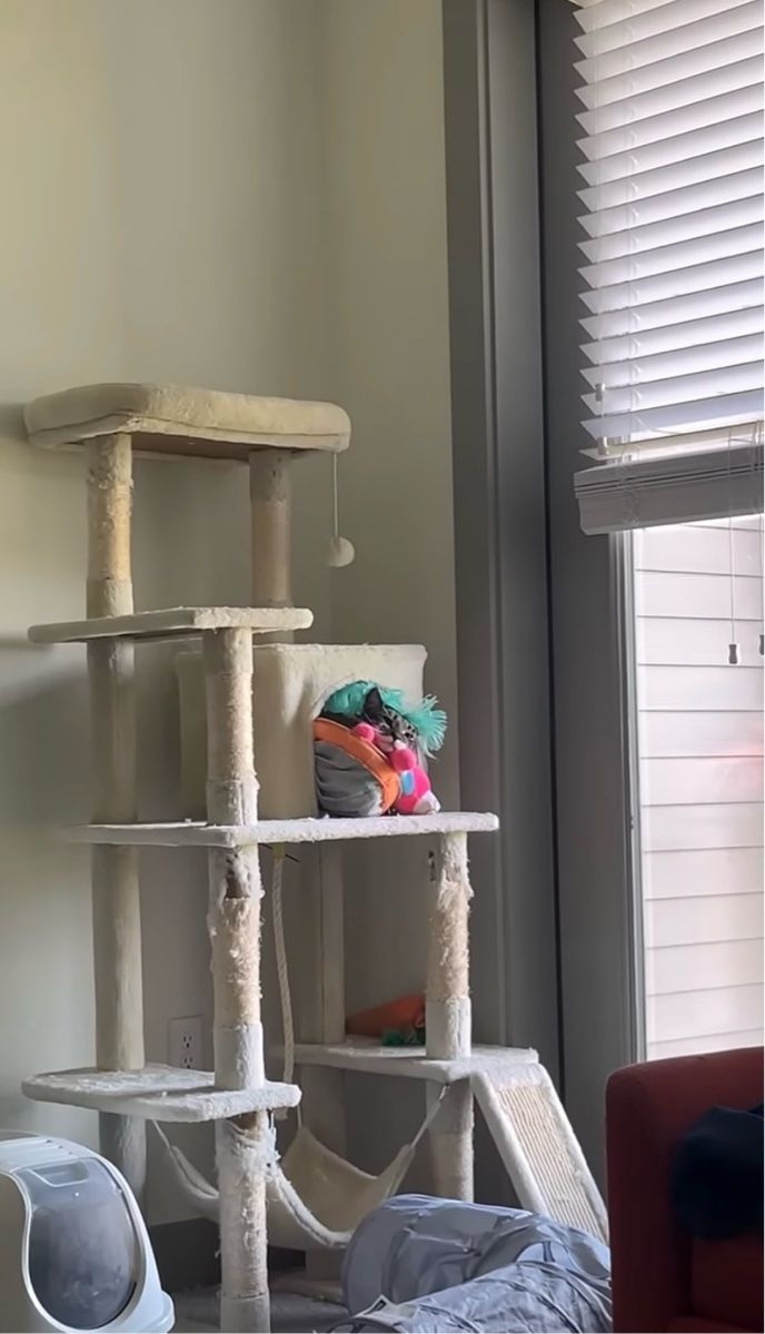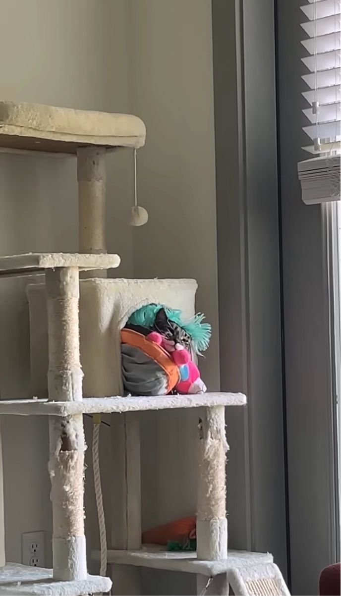 オモチャを詰め込みすぎた!?キャットタワーのハウスから出られなくなったネコが不憫だけどかわいい【アメリカ・動画】