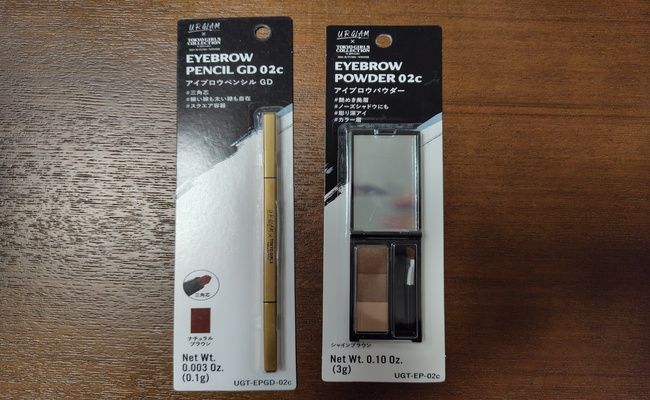 今回、自分にとって新しい眉の形は初めての挑戦なので、価格が安くてお試ししやすいダイソーのポイントメイクコスメから、アイブロウペンシルとアイブロウパウダーを探すことにしました。ダイソーにも何種類かシリーズが置いてあり、アイブロウペンシルは三角芯で削る手間なく細い線が描けそうだったU R GLAM(ユーアーグラム)の秋冬カラーのUGTアイブロウペンシルGD02cナチュラルブラウンが一番に目に留まりました。それと合わせてUGTアイブロウパウダー02cシャインブラウンを購入することにしました。