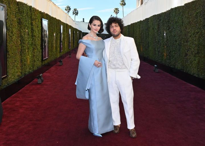 音楽プロデューサーのベニー・ブランコと婚約し、幸せいっぱいのセレーナ・ゴメス。パステルブルーのプラダのオフショルダードレスにティファニーのダイヤモンドネックレスを合わせたドレスアップは、まるで現代のシンデレラのよう。レトロなウェーブヘアも上品な雰囲気です。