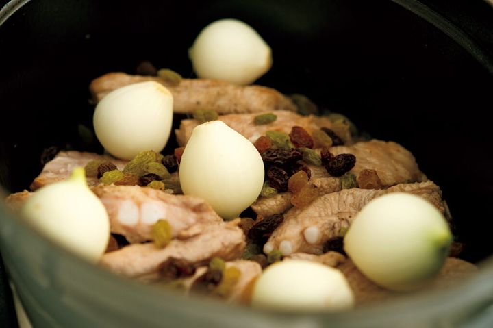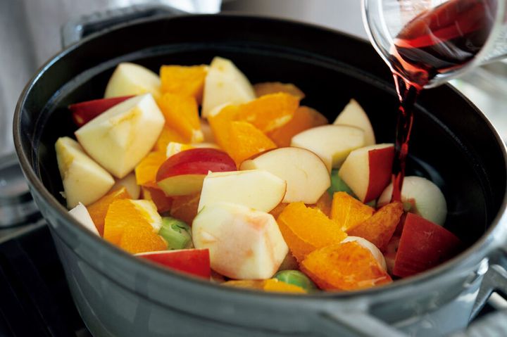 先生:まずレーズンをお肉の近くに置いてね。あとは切った野菜とリンゴ、オレンジ。最後にローリエをのせたら赤ワインを注いでフタをして、弱火で1時間煮込みます。