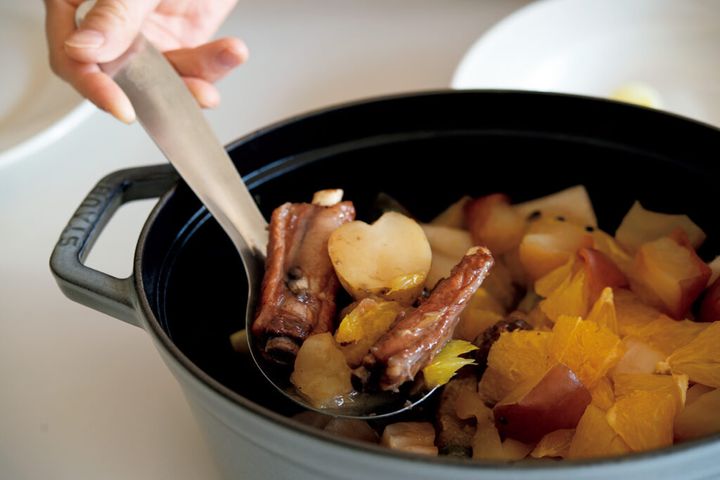 先生:それでは「スペアリブと果物の煮込み」から作っていきましょう。常温においておいた豚スペアリブに粗塩をすり込んで、黒胡椒と赤ワインビネガーをふって、20分マリネしておきます。お酢の効果でお肉が軟らかくなるし、さっぱり仕上がるの。
