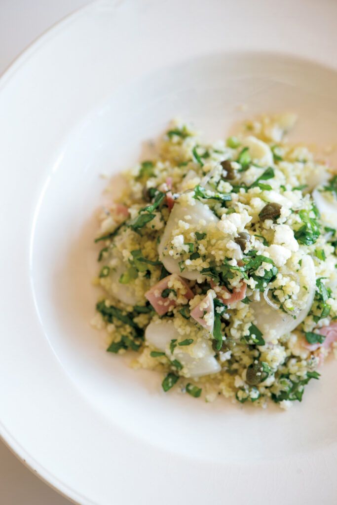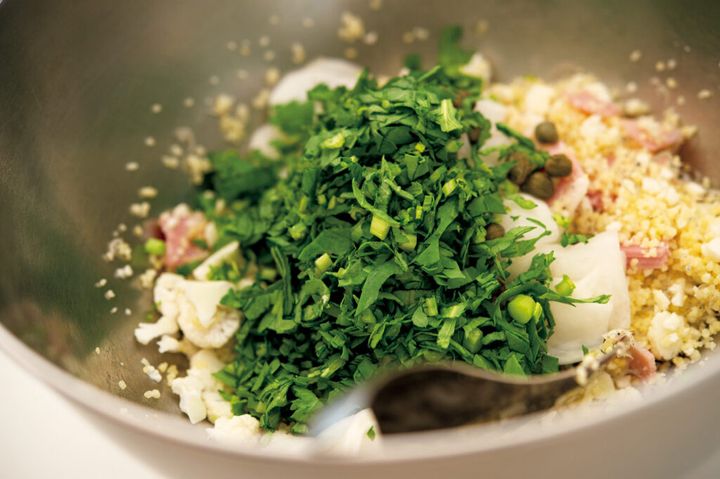 先生:カリフラワーは細かく切り、カブは皮をむき、半分に切って薄切りにして塩でなじませます。春菊は1㎝の長さに、ロースハムは1㎝角に切る。ボウルにクスクス、塩少々、オリーブオイルをふり、熱湯を注いでフタをして7分蒸らし、スプーンで混ぜてほぐします。カブを塩もみにするのは、カリフラワーとの食感の違いを出したいからなの。