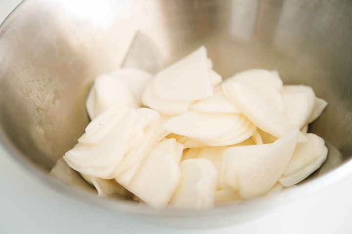 カブはボウルをふって塩となじませる。塩もみが入るとサラダの食感が豊かに。