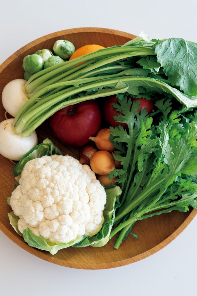 先生:ならば直子さんにおまかせして、私は野菜を切っていきますね。レンコンは皮つきのまま3㎝大に切り、酢水にさらしておきます。ジャガイモも皮つきのまま半分に切って水にさらしてね。小玉ネギは皮をむいて、芽キャベツは芯の部分に十字に切れ目を入れます。リンゴは一口大に、オレンジは皮をむいて一口大に切りましょう。