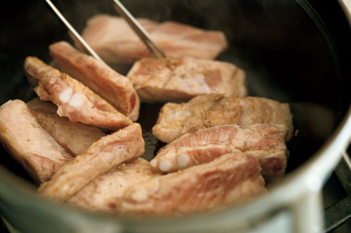 先生:次に豚スペアリブを焼きますよ。厚手の鍋をよく熱しておくと肉が鍋にくっつかないの。ほんのちょっとのオリーブオイルでニンニクを炒めます。しつこくならないように、香りが出たらニンニクは取り出します。豚スペアリブを強火で焼き付けたらマリネ液も入れて、さらに粗塩をふりましょう。