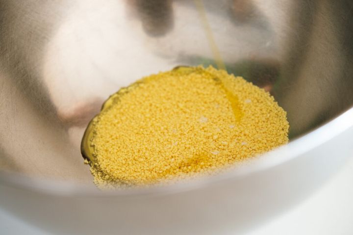 クスクスの下準備は塩とオリーブオイルと熱湯を入れて蒸らすだけ。手間いらず。