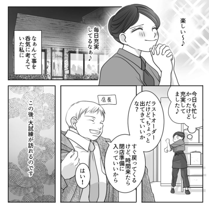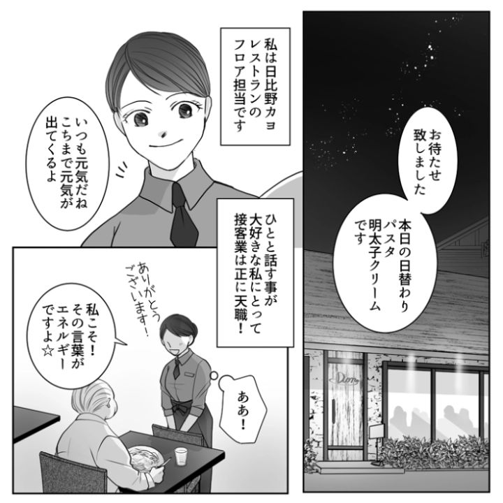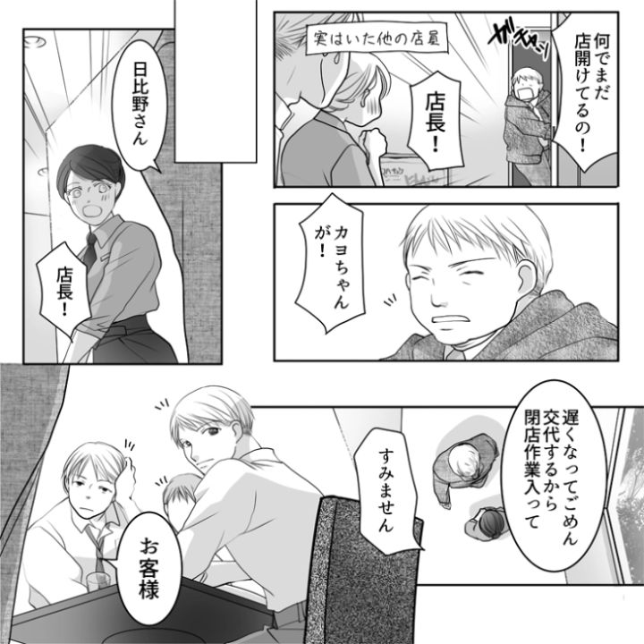 主人公のカヨは人と話すことが好きで接客業という仕事が心から好き。この日もお客さんとの会話を通して、本当に天職だと思っていた矢先、いや〜な出来事に遭遇してしまうのです。