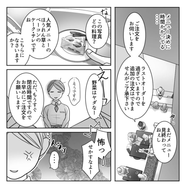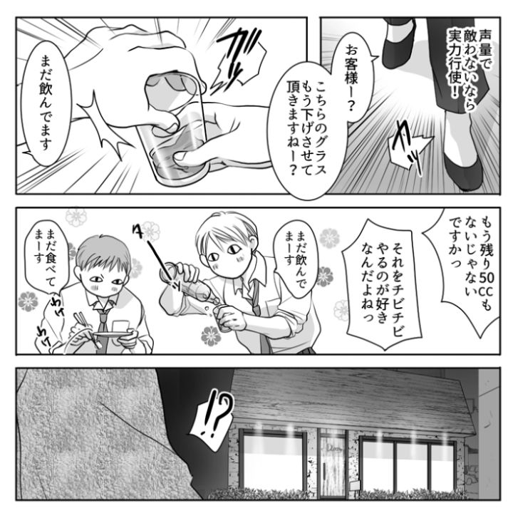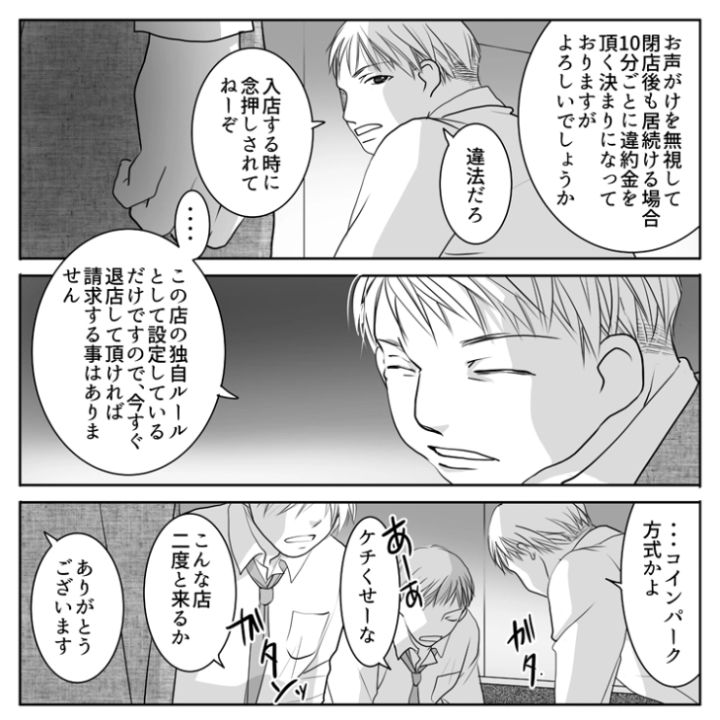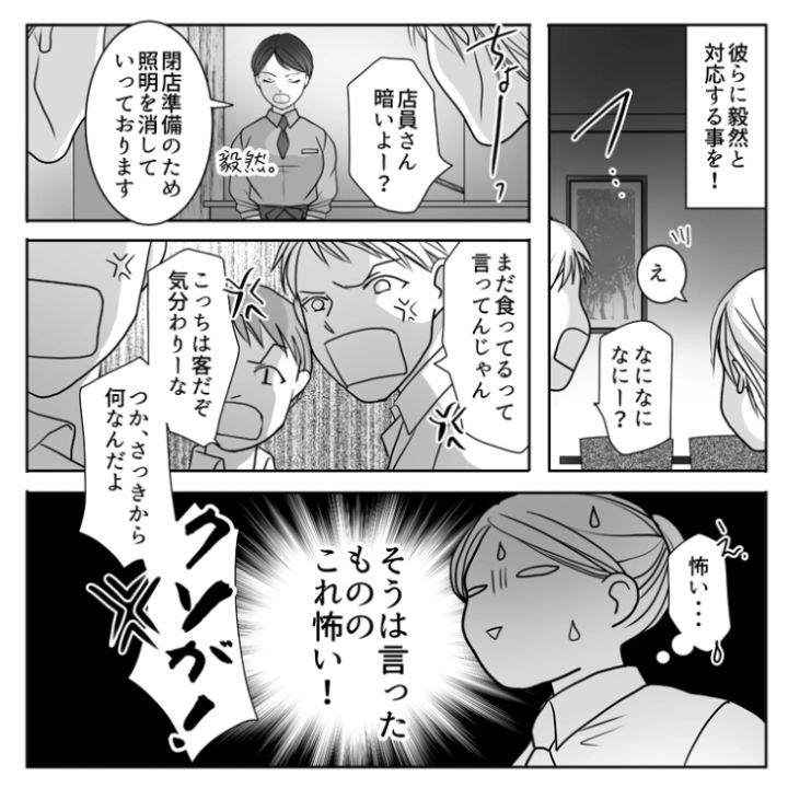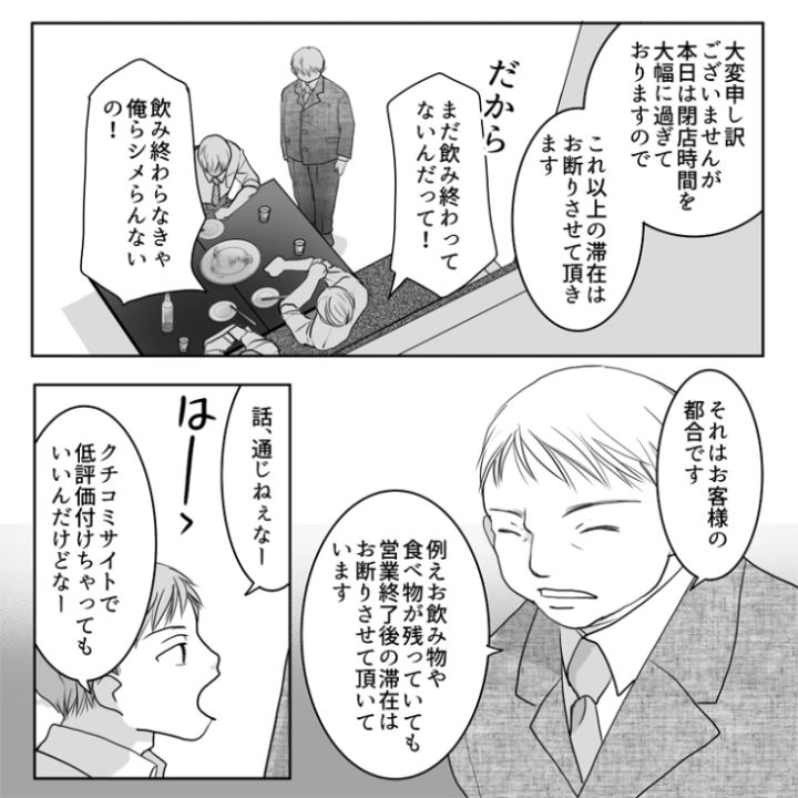 衝撃のエピソードを漫画化!今回は、閉店時間になっても一向に帰ろうとしない迷惑客たちとのバトルをご紹介!ありとあらゆる手を使って帰ってもらおうとするのですが、なかなか手強く困っていると救世主が現れて・・・。