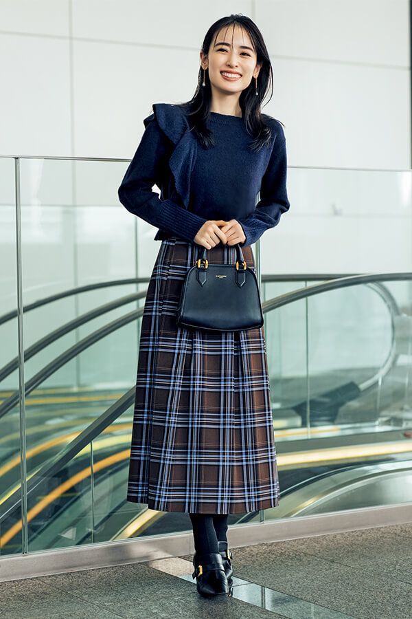 ネイビーにブラウンと色みはベーシックに徹しつつ、肩のフリルやチェック柄の洒落感で地味見えを回避♪ トレンドアイテムを上品に着こなせます。