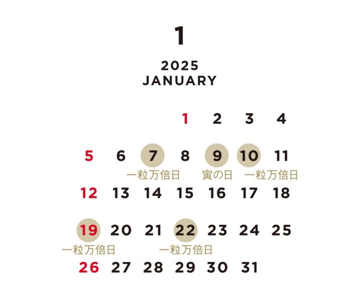 財布を使い始めたり、買い替えるタイミングとしてベストといわれる縁起のいい吉日。せっかくならそんな日を狙ってスタンバイを。1月は19日(日)と22日(水)が一粒万倍日です。