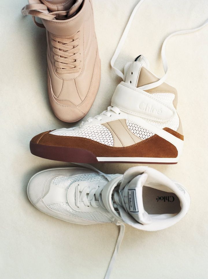 上から:ハイトップスニーカー〈クロエ キック〉[ソール2㎝]Pink Tea ¥124,300、Natural Brown、Cloudy Cream 各¥116,600(全てクロエ/クロエ カスタマーリレーションズ)