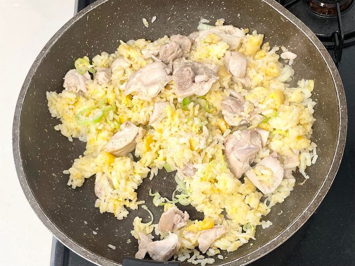 5. 塩・こしょう、鶏肉、刻んだねぎをくわえ、長ねぎのいい香りが出るまで炒め合わせます。