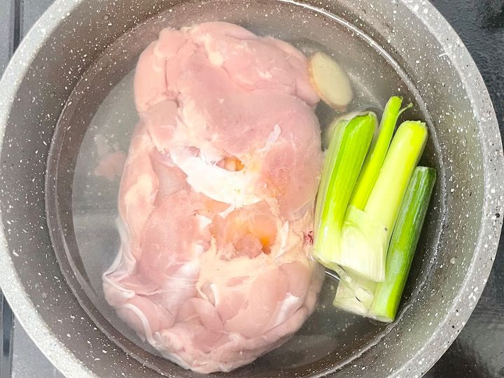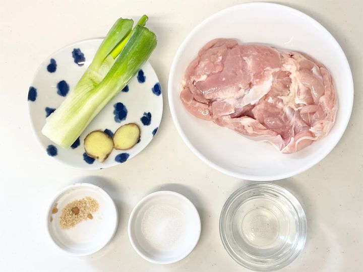 1. 小鍋に鶏肉、長ねぎの青い部分、しょうが、酒、鶏肉が浸かるくらいの水、塩、砂糖を入れ、中火にかけます。