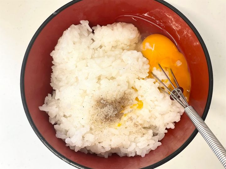 3. ボウルにご飯、卵、塩・こしょうを入れて、ホイッパーで混ぜ合わせます。