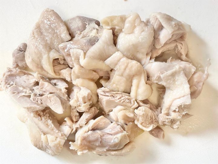 茹で鶏は30分かけて煮込んだので、プルプルしていてしっとりとやわらかく仕上がっていますよ。