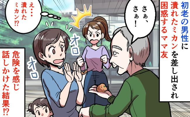 駅前で初老の男性に「潰れたミカン」を差し出され困惑するママ友…。危険を感じ話しかけた結果!?