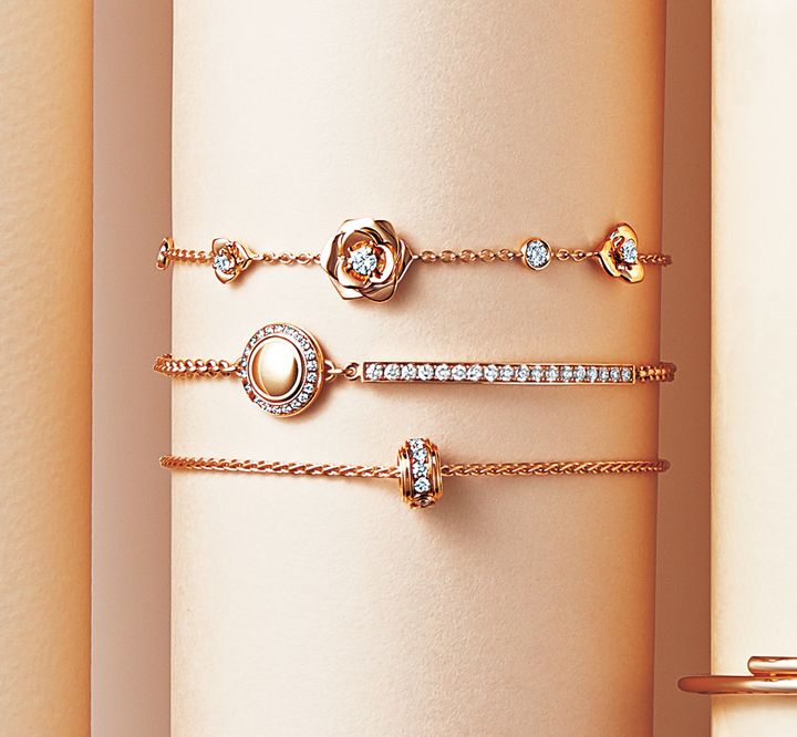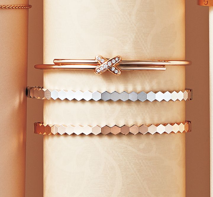 「リアン」コレクション ジュ ドゥ リアン ブレスレット〈PG×DIA〉¥925,100「ビー マイラブ」コレクション ハニカムブレスレット〈WG〉¥927,300〈PG〉¥870,100(すべてショーメ)