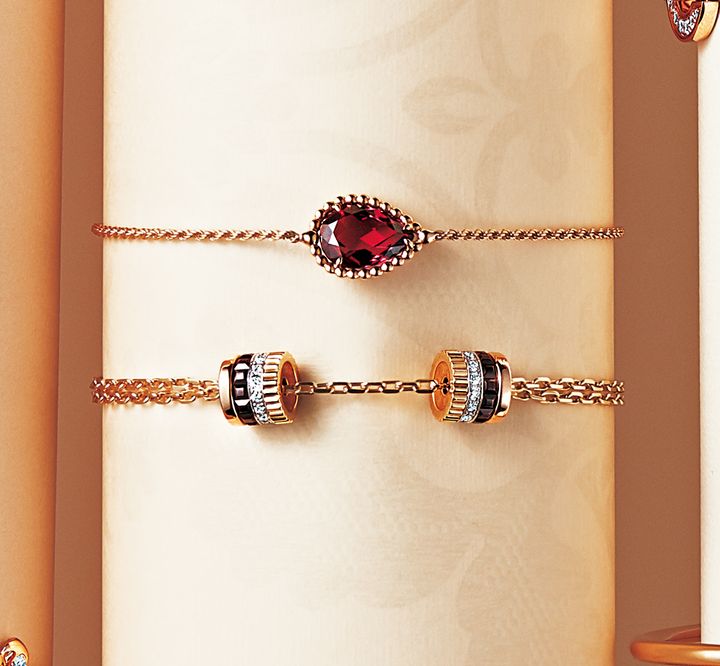 「セルパンボエム」ブレスレット スモール〈PG×ロードライトガーネット〉¥368,500「キャトル」 クラシック 2モチーフ ブレスレット〈WG×PG×YG×ブラウンPVD〉¥792,000ともに予定価格(ともにブシュロン/ブシュロン クライアントサービス)