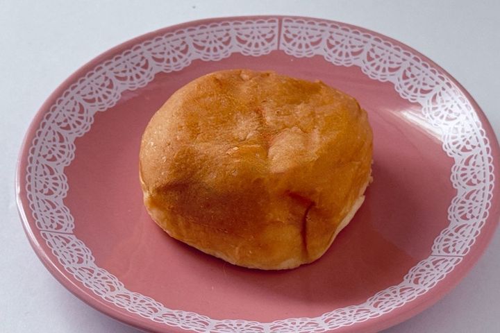 握り拳ほどのクリームパンで、手のひらにのせると見た目よりもずっしりと重め。パンの表面は、しっとり、やわらかな手ざわりです。
