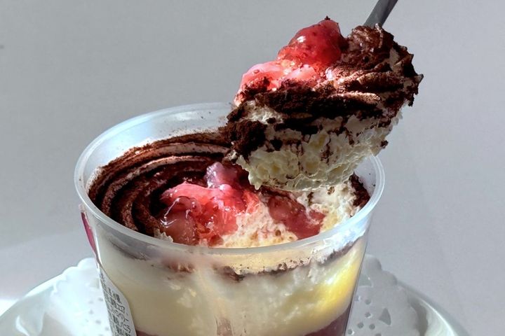 食べすすめていくと、中間層にはシロップをジュワッとしみ込ませたいちご味のスポンジ、一番下からは果肉入りのいちごソースも登場。 少しずつ味わいを変えながらも、終始、甘ずっぱくてフレッシュ感のあるいちごとマスカルポーネチーズのハーモニーが楽しめます。