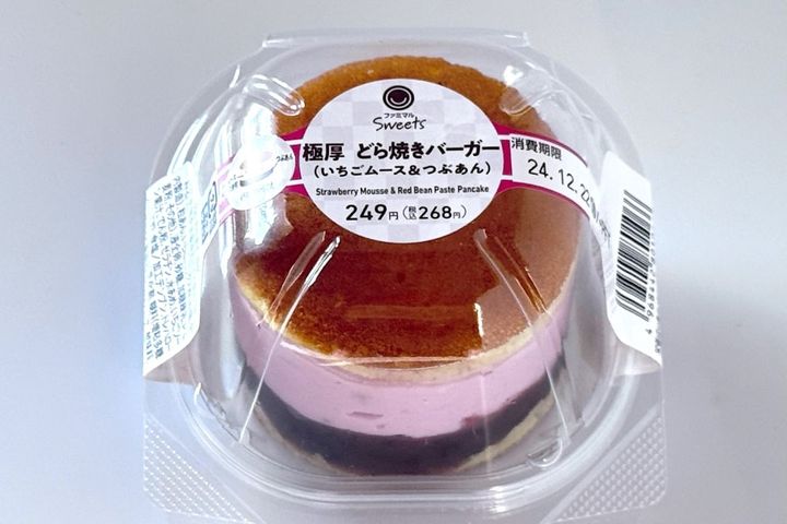 次は、ファミマルSweets「極厚 どら焼きバーガー(いちごムース&つぶあん)」268円。