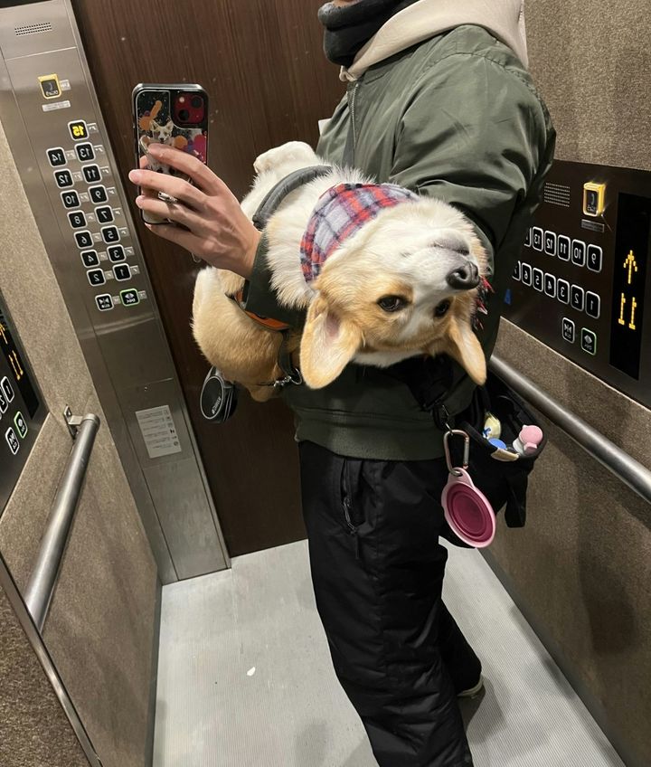 お散歩に行って疲れてしまったようで、抱っこをおねだりしたのでしょうか。すっかり安心しきった様子で、運ばれていく様子がなんとも言えずかわいらしいですよね。飼い主さんを心から信頼している様子がよく伝わります。甘えるのも、わがままも信頼関係や相手への好意があるからこそ。本当に人間に子どものようですね。