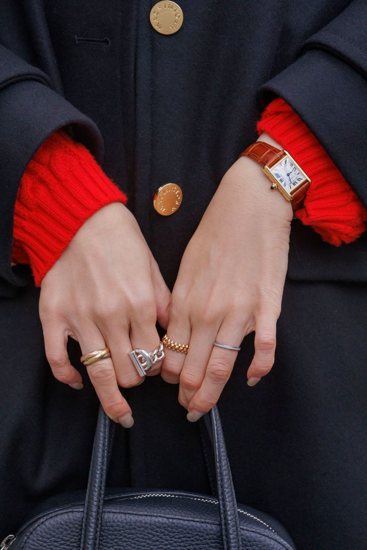 ring/Cartier(左手と右薬指)、HERMÈS (右人差し指) watch/Cartier earrings/ripsalis coat/MACKINTOSH knit/MACPHEE pants/yori(shirocon) bag/vasic shoes/i need more shoes