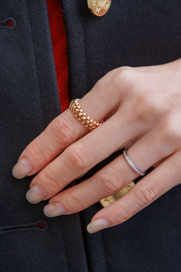「カルティエが好きで、去年の誕生日にお迎えしたリング。私には強すぎるかな?と最初は思いましたが、つけてみたらそんな戸惑いは一蹴。エッジが効いたかっこよさの中にクラシックな雰囲気を感じ、年齢を重ねていく手元にもずっと寄り添ってくれることを確信しました。結婚指輪だけだと寂しくなりがちなので左手がクラッシュの定位置です」福岡未来さん・40歳(163㎝ 3歳の男の子ママ)