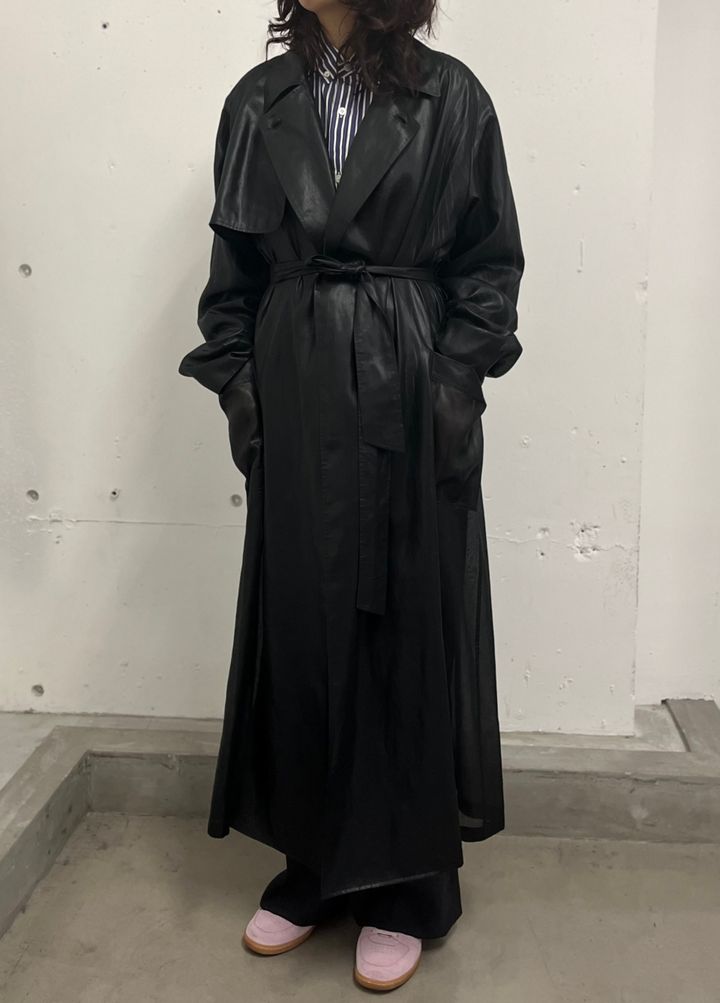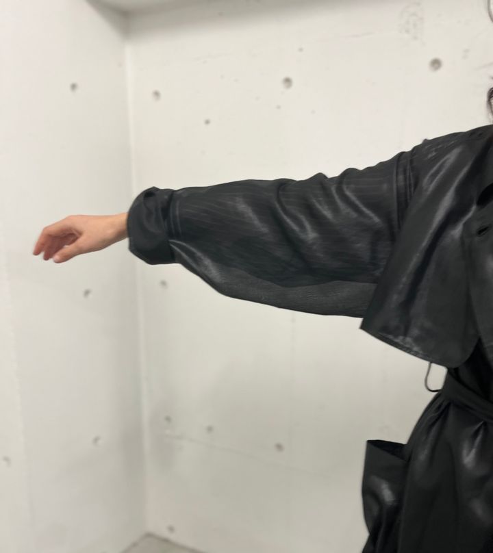 で、2025年春夏の展示会でとくに気になったのが、こちらのトレンチコート。一番の推しポイントはシアーな素材感です。昨年に引き続き、今シーズンも”透け”はトレンドになっていますが、これはその具合が絶妙なんです。そもそもシアーな素材って、透け感が強すぎるとインナーになにを着るか迷っちゃうし、かといって透け感が弱いと魅力が活かせない、なかなか難しい素材でもあります。でもこれはインナーが少し見える程度の透け感というのがドンピシャですし、黒ながらもきちんと軽やかさもあります。