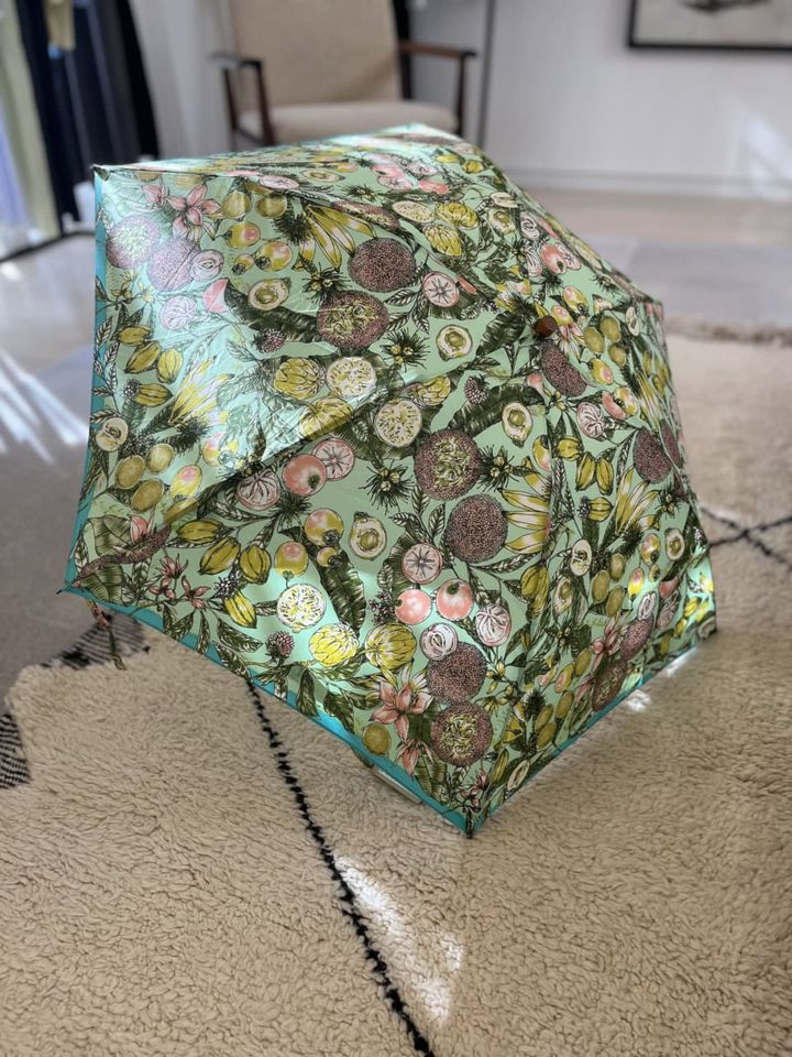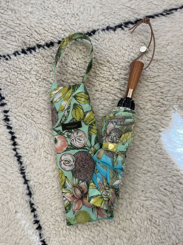 そんなときに展示会で出合ったのがこちら。そもそも【manipuri】の傘は、憂鬱な雨の日の外出が楽しくなるカラーリング&柄が気に入っていたんです。前回はイエローをベースにしたボタニカル柄を愛用していましたが、今回はフルーツ柄をセレクトしてみました。フルーツ柄って子どもっぽいイメージがあるかもしれませんが、これは手描きのタッチのプリントとグリーンを基調にしたカラーリングのおかげで大人っぽく、さらには独特なヴィンテージ感があるのもおしゃれですよね。