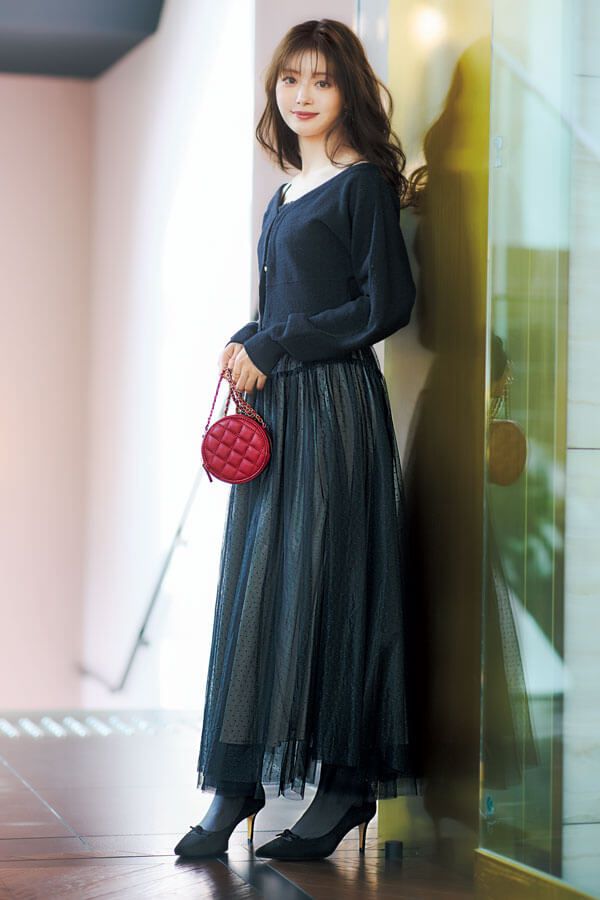 チュールやレースなどの透ける素材なら、黒でもどこか軽やか。 冬素材のオールブラックにも1点混ぜ込むだけでグッと軽やかな印象になり、 重見えが解消されて着こなしやすくなるのでお試しを!