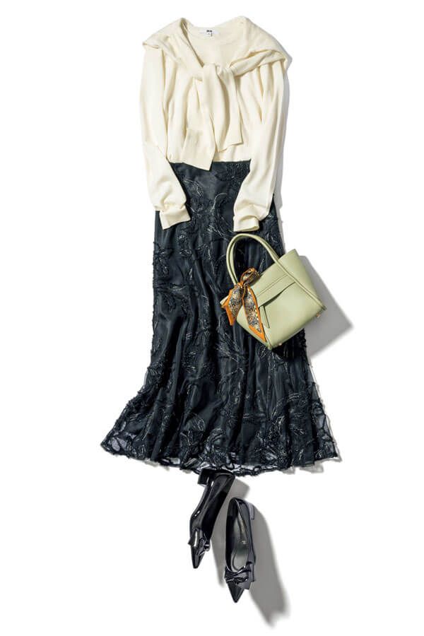 白のアンサンブルニットでブラックロンスカに抜け感を。切り替えのない腰まわりすっきりデザインのハイウエストスカートを合わせることで、スタイルアップ効果を発揮。刺しゅうをあしらった立体的なデザインで重く沈む心配なし♪